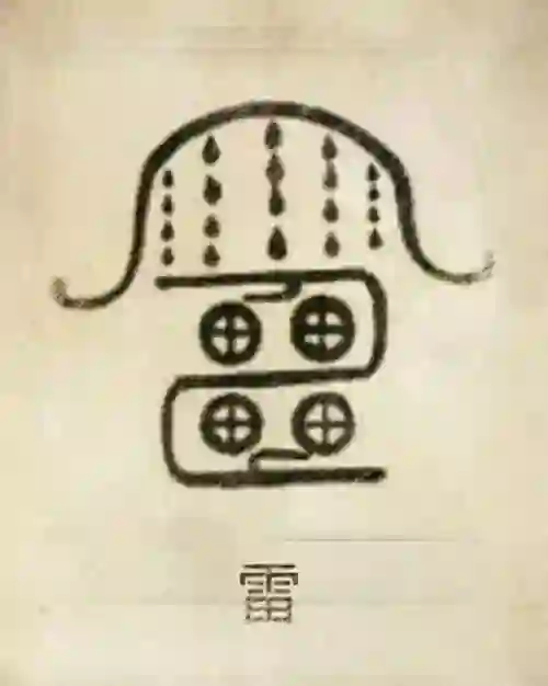 有雨雷组成,雨像天穹(几为风的初文)中的水滴,是“天一生水”的宇宙观照,雨下之田是雷鼓象形,周环以电光,是自然图腾的典型。