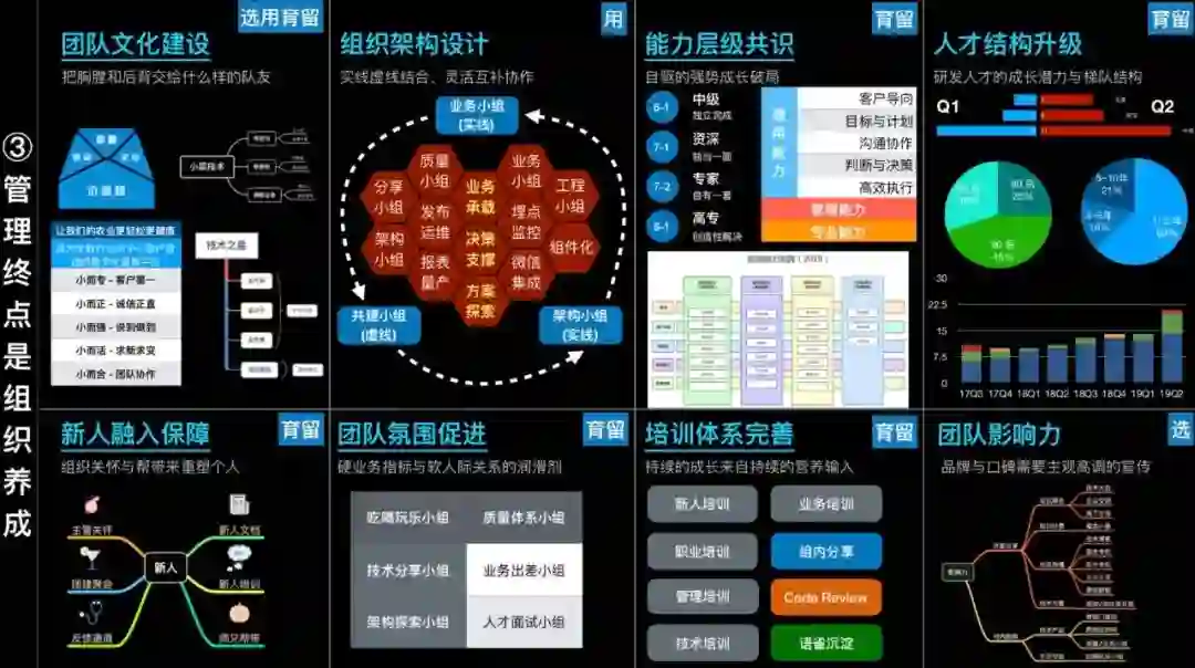 如果要带团队把它带到自己理想中的状态,除了背后的公司薪资福利整个激励体系的支撑外,我这边还列了另外几个,这些都是管理者可以在不同的阶段,来花精力关注的,比如团队文化建设、组织架构的设计和调整、能力层级的共识晋升通道、人才结构升级、新人融入保障、团队氛围促进、培训体系完善、团队影响力的建设等等,今天时间有限就不做展开了。