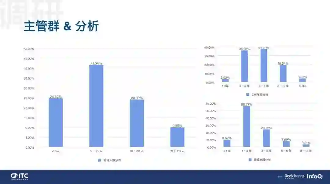 上图是对这 170 个的前端主管抽样后做的图表。可以发现,大部分主管所带团队人数是在 10 人以下的,占比大于 65%,这些都是属于是中小型的团队,或者说是比较小型的团队。然后这些主管的工作经验,3~8 年的占比是最多的。他们的管理经验在 1~3 年这个阶段是最多的。说明从 2016~2019 年近 4 年的时间里,前端主管在整个行业中的需求量越来越大了。