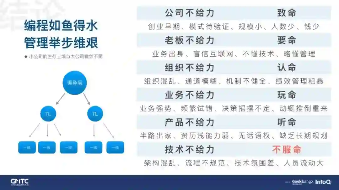 最后万众创业的背景下,诞生了那么多的中小型企业,每天在经历生死存亡各种倒闭的状况下,它们制度体系和晋升空间都参差不齐的,更不要提技术成长的土壤,在这样的环境中做管理,难度大家可想而知。