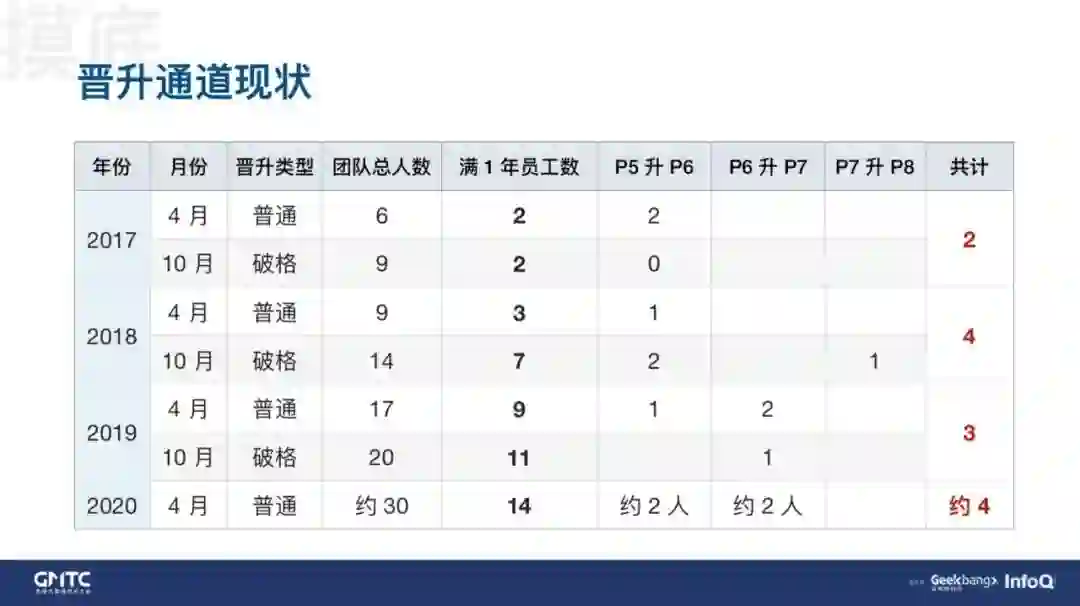 实际上,之前我们公司是没有一个明确的晋升通道,只是口头上讲。直到 2018 年底,我们公司终于有了非常完整的一套晋升体系,在过程中包括我以及其他的主管,也都在推动这件事情。我每年都会去做盘点,看团队里面有多少同学可能达到晋升标准,如果这个东西不透明,员工就很容易没有目标。
