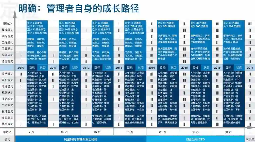 我按照时间线把能力全拆分出来,上半部分是我的专业能力,就是跟技术相关的,下半部分是一些通用能力,分层分阶段的剖析我的心理状态、事业目标、精力分配的强度、对行业思考的宽度和深度等等。做一个长时间轴的广视角的能力矩阵和职业路径的观察,这是我进公司后做的第一件事,就是把我自己给弄清楚了,这也是我平时对微信群小伙伴做辅导的一个基础工具,再叠加上其他的工具以及我的人生和职业经验,我就有把握对任何一个年轻的前端输出一些通用的方向指导、点拨和启发,帮他更好地规划自己在每一个职场每一次项目中如何定位自己,以及何去何从。