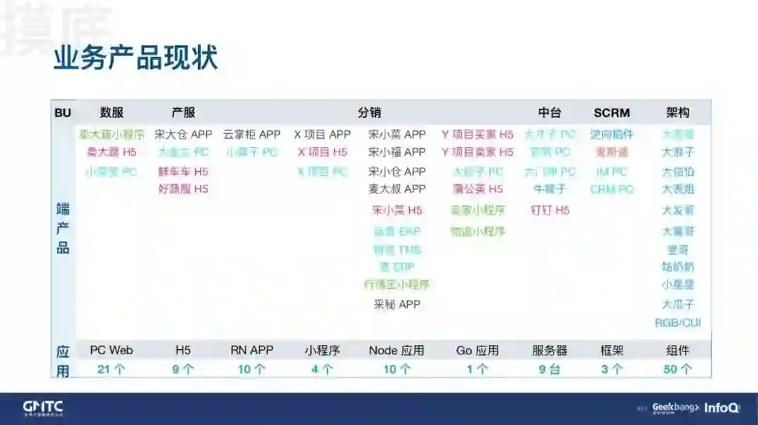比如像 H5 的组件,我们目前才做到 20%,因为 2018 年之前,我们只有 App 和 PC 端,我们在 H5 上没有任何的需求,但是 2019 年开始,我们就开始拥抱微信、社群生态,所以这个时候微信、H5,以及买家、卖家、商城各种全起来了,越是这种时候越要鼓励一些同学去做基建的工作。