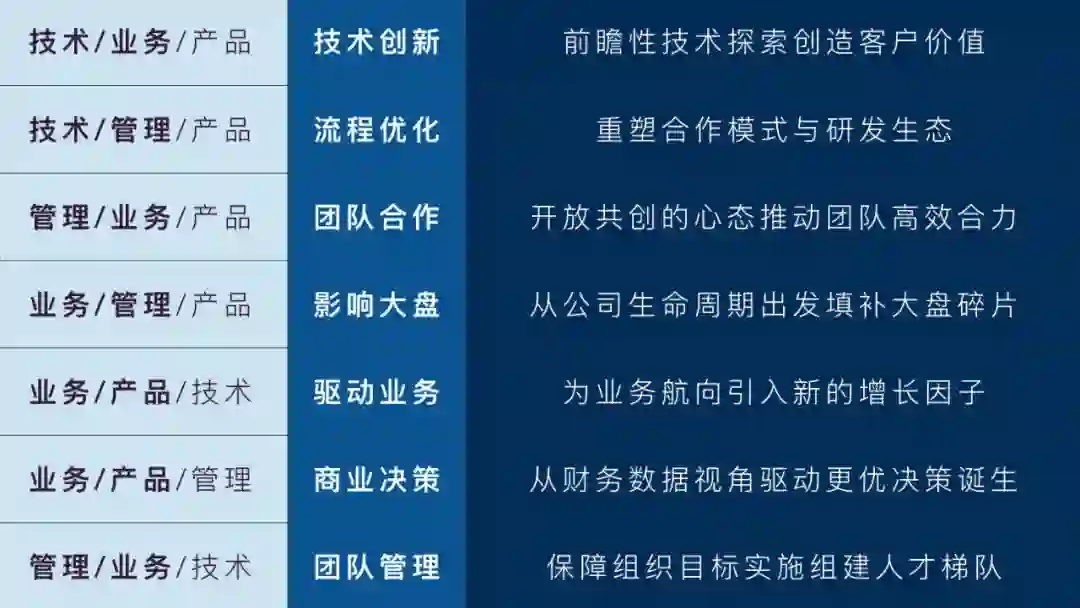 除了基础技能外,要把管理者的价值打足,就一定需要有产品、业务包括管理的综合能力: