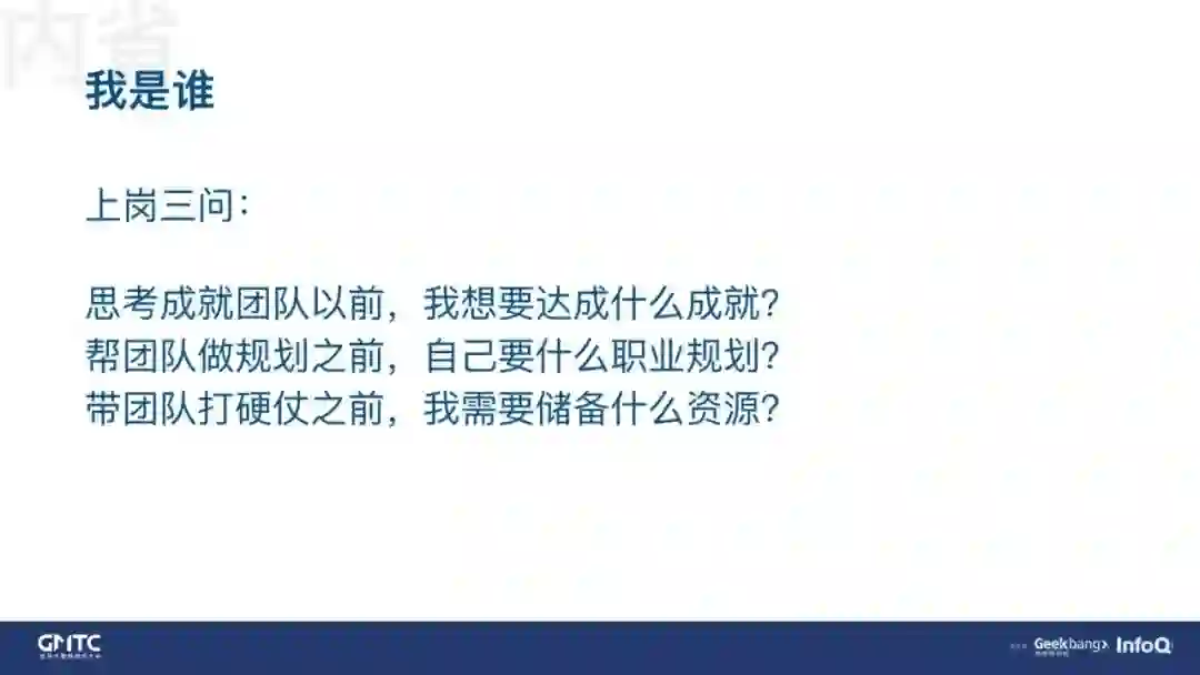 我是谁?我在公司作为技术主管,我们开口都是发展他人,成就他人,那首先要问问我自己能达成什么成就?我想要达到什么成就?如果要辅导他人,带团队成员给他们做规划,那前提是我自己总要有能力给自己做规划吧。然后带团队肯定是在为公司“打仗”做项目,在打仗前中后,我会需要什么样的资源,那所有这些问题,都要在带团队的初期尽量想清楚。