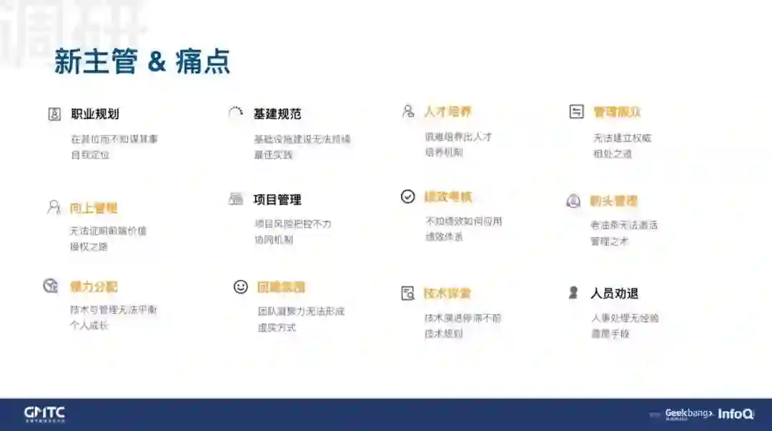 新上任的主管,无论是他空降过来,还是晋升上来,还是被他老板拔苗助长提拔上来,一般都会遇到很多问题。之前调查的 170 个主管反馈的问题非常之多,我就简单对他们做个归类,抽离了共性的部分,这里面标黄的几个痛点是反馈最多的: