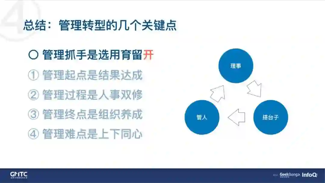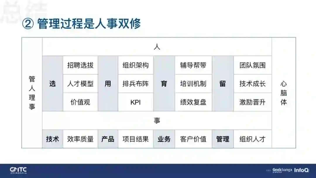实际上,我们说选育留好像是一个非常虚的东西,它的背后其实是有逻辑的。对于人怎么选、选什么人、做什么事、怎么去定目标,怎么评估?都是要想清楚的,并且对技术、产品、业务以及管理全部要兼顾,在整个过程里面,基于事练就人,基于人成就事,而靠管理智慧链接人和事的关键人物,就是作为管理者的你,最终所谓的人事双修,也是对你而言可以达到心力脑力体力上的综合提升。