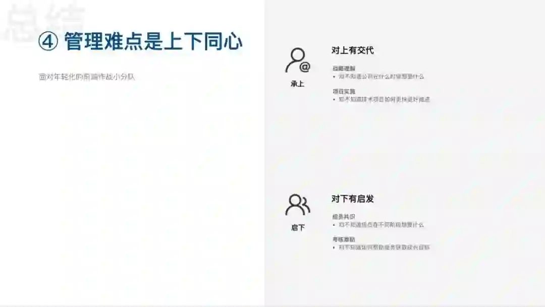 综上所述,发现前端团队虽然小,但是它可能比服务端还难带。另外从前端一个写代码的身份,慢慢走向到管理的过程,看似很简单,写页面做项目就好了,但实际上要复杂得多。
