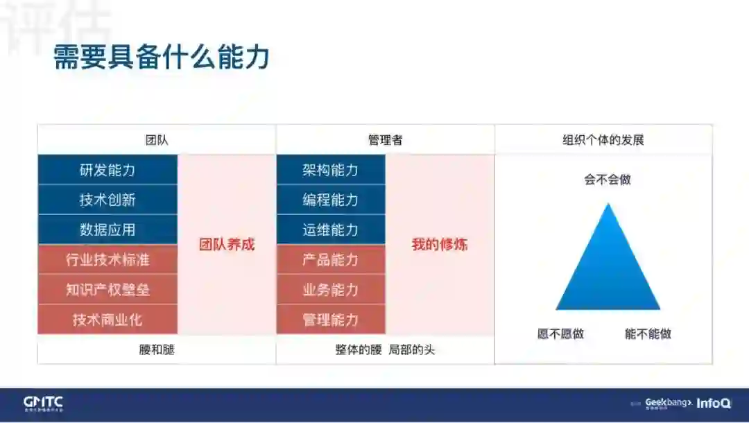 从团队角度,对我而言一定是团队的养成,为了促成这个目标,这个团队在我们公司是需要具备研发、技术创新、数据应用、制定行业技术标准推广布道、知识产权壁垒的搭建和技术商业化等能力。