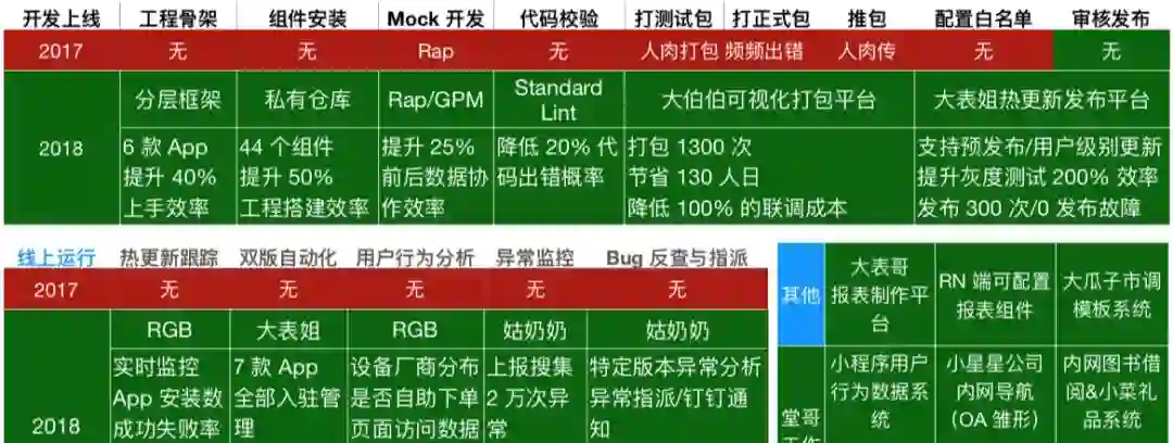 当公司的业务起量或者重大项目并行的时候,经常发现人力瓶颈。实际上,往往就是团队的基建体系不完善导致了生产力无法得到释放。上图是我 2019 年做的一个盘点,各种技术设施我们都有,但是目前很多都只是刚刚起步不久。