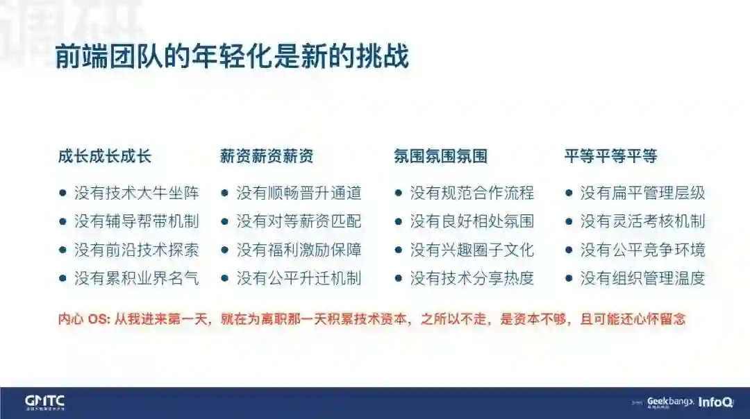 成长:现在的同学对于成长诉求是非常强的,不管你是大公司小公司,如果新同学在这里得不到非常好的成长,那是留不住人的。因为前端的技术变化很快,他很担心成长跟不上,呆个两三年就废掉了,失去了自身的竞争力。