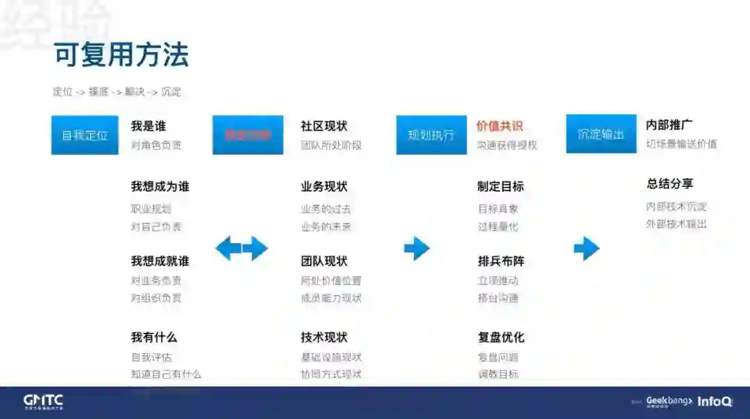 对于中小前端团队的管理者,有一些很简单的方法是可以直接应用的,我提炼了可复用的方法,简单总结为 4 步,自我定位、摸底诊断、规划执行、沉淀输出,其中的定位和摸底是双向影响的,要花足信息来做,那么时间关系,这里我主要讲下规划执行。