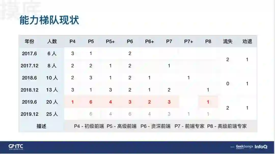 我每年会对团队成员进行摸底和诊断,比如有多少初级、中级、高级、资深专家,我会看团队里面有多少同学能够晋升,哪怕在晋升通道不透明时,我们也可以用能力梯队来判断成员的能力。