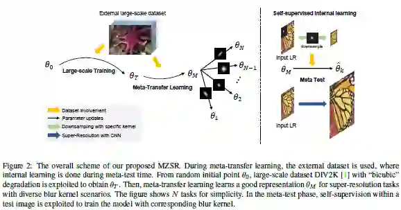 以往的零样本超分辨率方法需要数千次梯度更新,推理时间长。这篇论文提出用于零样本超分辨率的元转移学习。基于找到适合内部学习的通用初始参数,所提方法可以利用外部和内部信息,一次梯度更新就可以产生相当可观的结果,因此能快速适应给定的图像条件,并且应用于大范围图像。