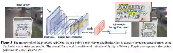 现有方法基于字符或基于分段,要么在字符标注上成本很高,要么需要维护复杂的工作流,都不适用于实时应用程序。这篇论文提出了自适应贝塞尔曲线网络(Adaptive Bezier-Curve Network ,ABCNet),包括三个方面的创新:1)首次通过参数化的贝塞尔曲线自适应拟合任意形状文本;2)设计新的BezierAlign层,用于提取具有任意形状的文本样本的准确卷积特征,与以前方法相比显著提高精度;3)与标准图形框检测相比,所提贝塞尔曲线检测引入的计算开销可忽略不计,从而使该方法在效率和准确性上均具优势。对任意形状的基准数据集Total-Text和CTW1500进行的实验表明,ABCNet达到当前最佳的准确性,同时显著提高了速度,特别是在Total-Text上,ABCNet的实时版本比当前最佳方法快10倍以上,且在识别精度上极具竞争力。