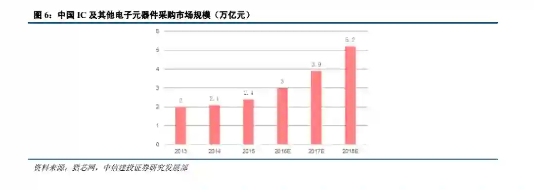 据中信证券研报显示,截至2017年年中,我国IC采购市场规模已超过2.5万亿元。易观智库资料显示,2015年至2018年的年平均复合增长率接近30%,预计2018年这一规模将达到5.2万亿元。