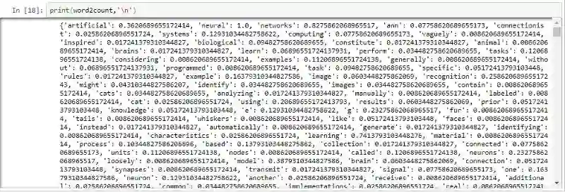 行4: 计算每个直方的权重(请看输出,你就可以看到这些权重并不是简单计数,比如‘artificial’:0.3620689)