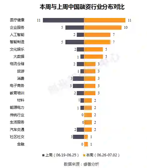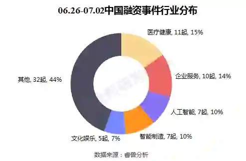 相比于上周,医疗健康热度不减;企业服务相比上周5起有所增加;人工智能本周有7起,相比上周2起有所回暖。