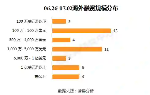 本周海外融资事件的融资规模主要集中在100万-500万美元,共13起。