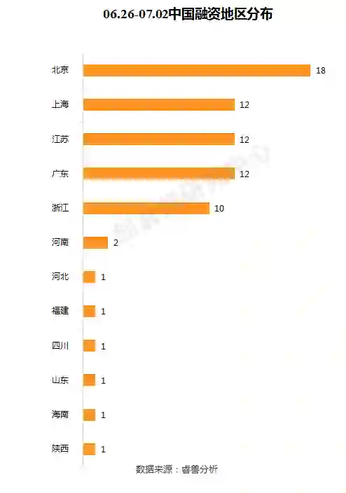 本周北上广融资事件共42起,占比58.33%;江苏有12起事件,与上海、广东并列;浙江有10起事件。