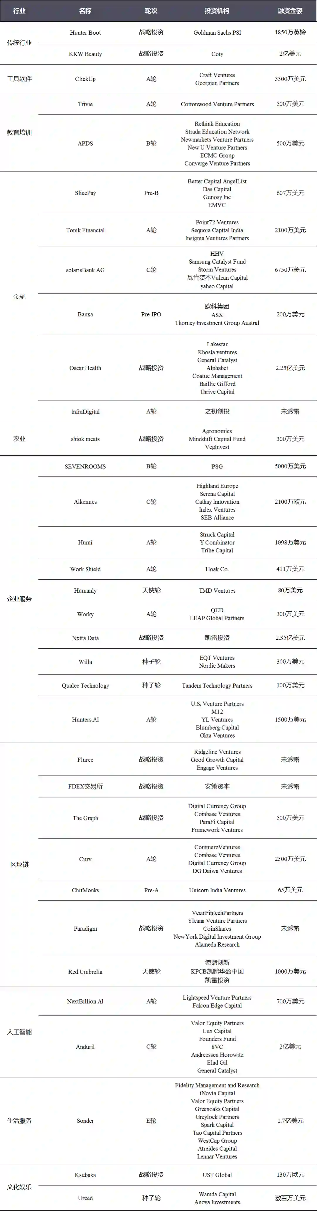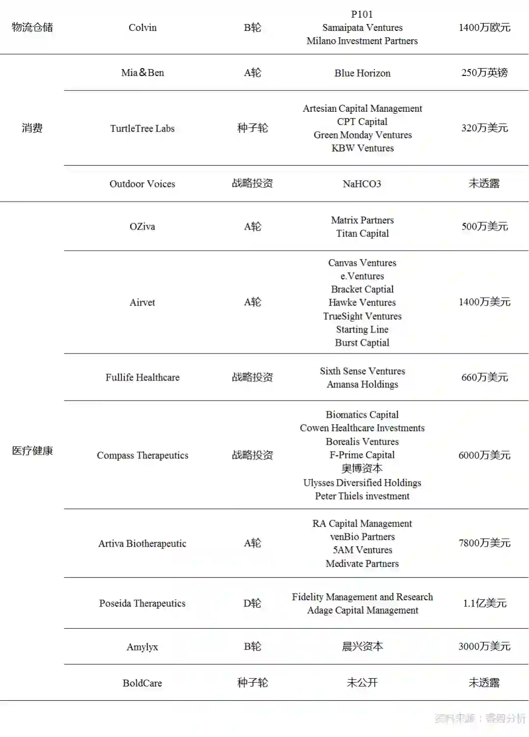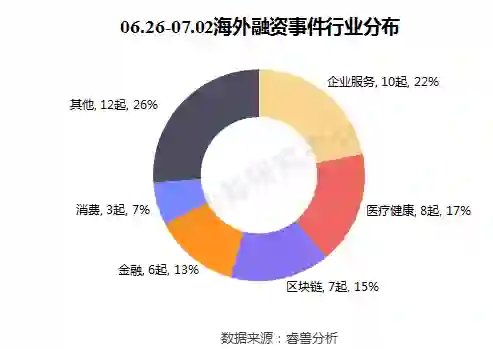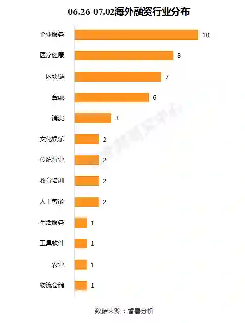 本周披露海外融资事件涉及13个行业领域,其中企业服务10起,医疗健康8起,区块链7起,金融6起,消费3起。