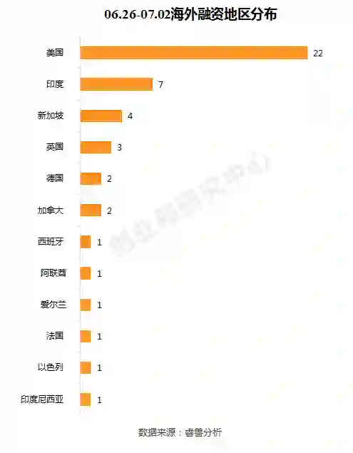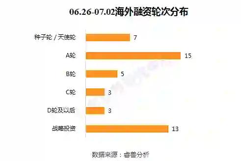本周海外融资事件的融资轮次分布主要集中在前期(种子轮、天使轮、A轮)有22起;中后期(B轮、C轮、D轮及以后)有11起;战略投资本周有13起。