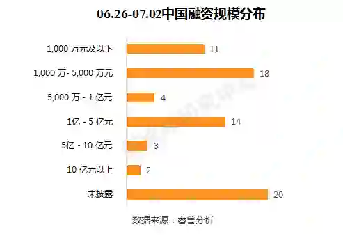 本周融资事件的融资规模在1,000万-5,000万元的数量最多,有18起。
