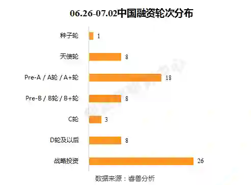 本周融资事件的融资轮次主要集中在前期(种子轮、天使轮、A轮),共27起,其中A轮有18起;中后期(B轮、C轮、D轮及以后)共19起;战略投资本周有26起。