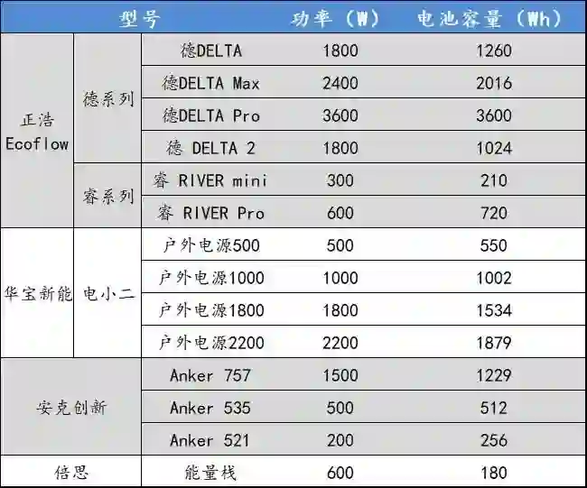 具体来看,以一级市场火热的EcoFlow和德兰明海为例,二者产品多以大功率电源为主,比如EcoFlow推出的德DELTA系列,额定功率在1000wh以上,德DELTA Pro达到了3600wh;而安克创新最新推出的一款757便携式储能产品,其带电容量也达到了1229wh;相对来讲,华宝新能多以小功率电源为主,不过其正在向大功率发力,新推出的产品2000 Pro,可以达到2160Wh容量。