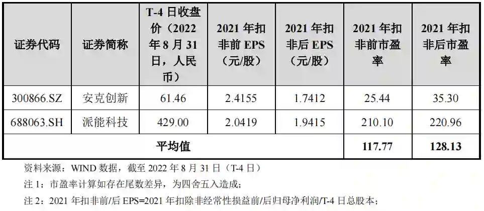 在华宝新能的招股书中,给出了两家可比公司:安克创新和派能科技。但两家同口径的市盈率却相差甚远,分别为35.30倍和220.96倍。