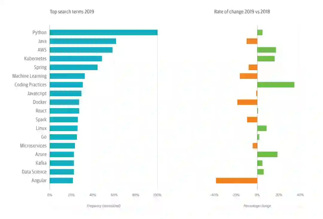 图注:2019 年 O'Reilly 在线学习平台上热门术语的标准化搜索频率(左)和每个术语的变化率(右)。