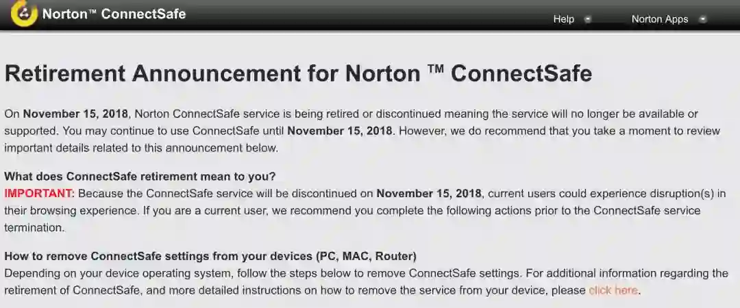 现在,赛门铁克宣布将于 2018 年 11 月 15 日关闭 Norton ConnectSafe 服务,届时使用 Norton ConnectSafe DNS 服务器的设备将无法再连接到 Internet 站点和其它互联网服务。如果有在使用 Norton ConnectSafe 的用户建议尽快更换到其它公共 DNS。