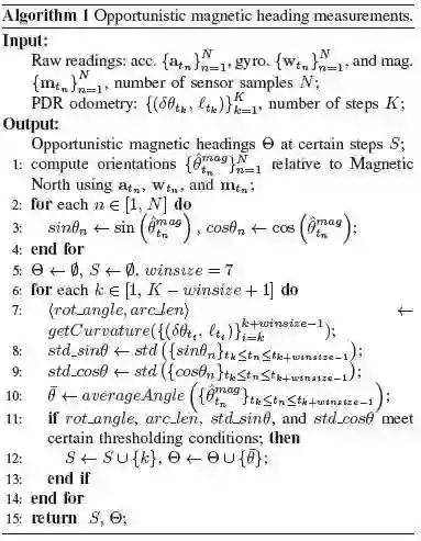 A. PDR:在本文的方案中,PDR获得的姿态信息被大量用于构建GraphSLAM前端,因为它们提供信息性运动模式以辅助磁性序列分割,机会性磁航向测量和姿态图生成的运动约束。