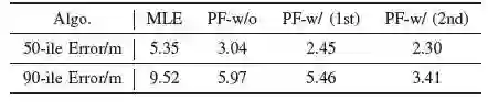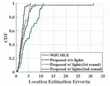 我们沿着走廊放置了25个检查点,并使用平面布置图得出了它们的地面实况位置。 然后生成累积分布函数图(CDF)用于误差分析,如图5所示。表3总结了50百分位和90百分位的精度,用于三种定位算法,即WiFi MLE,没有光和没有光的粒子滤波测量。