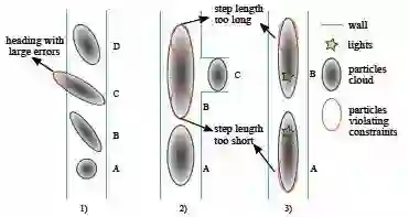 图2:1)具有较大航向误差的颗粒撞击墙壁并在从A变为D时消亡; 2)转弯时,步长太长或太短的颗粒撞到墙上; 3)违反光约束的粒子在每次光检测事件中消亡。