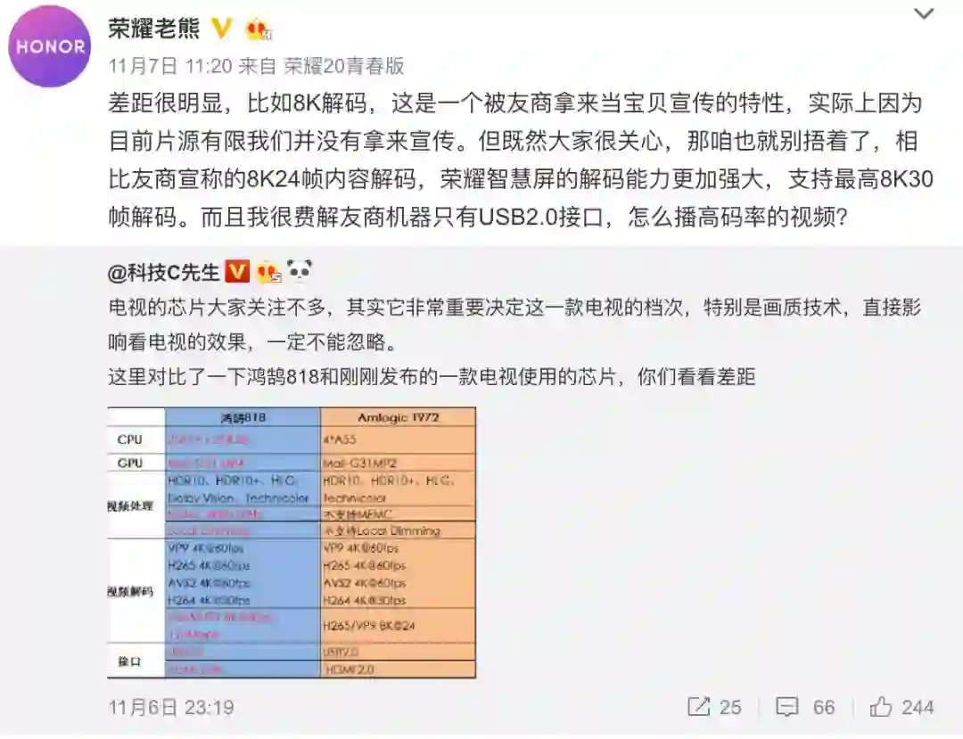 仅仅两天后,荣耀业务部副总裁(产品)熊军民就在微博上开怼,称荣耀的视频解码能力更为强大,之所以没有拿8K解码拿来宣传,是因为目前片源有限。
