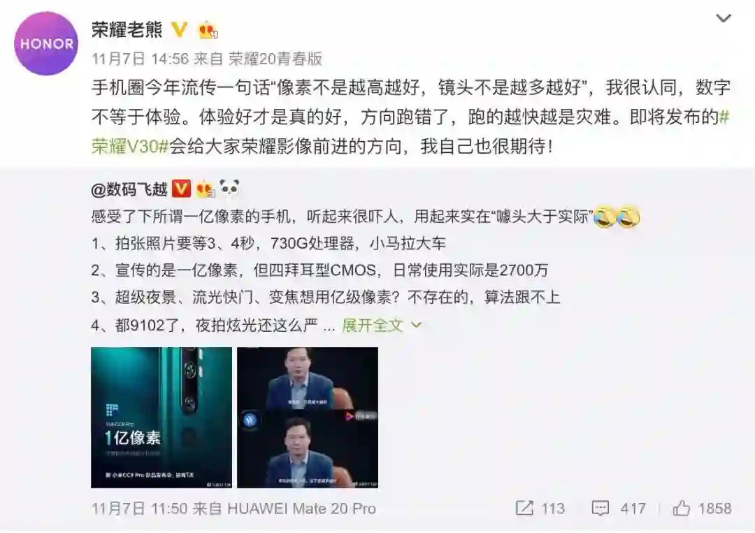 虽然荣耀嘲讽小米‘像素不是越高越好,镜头不是越多越好’,但实际上,华为也是采用了同样的方式追赶三星、苹果。