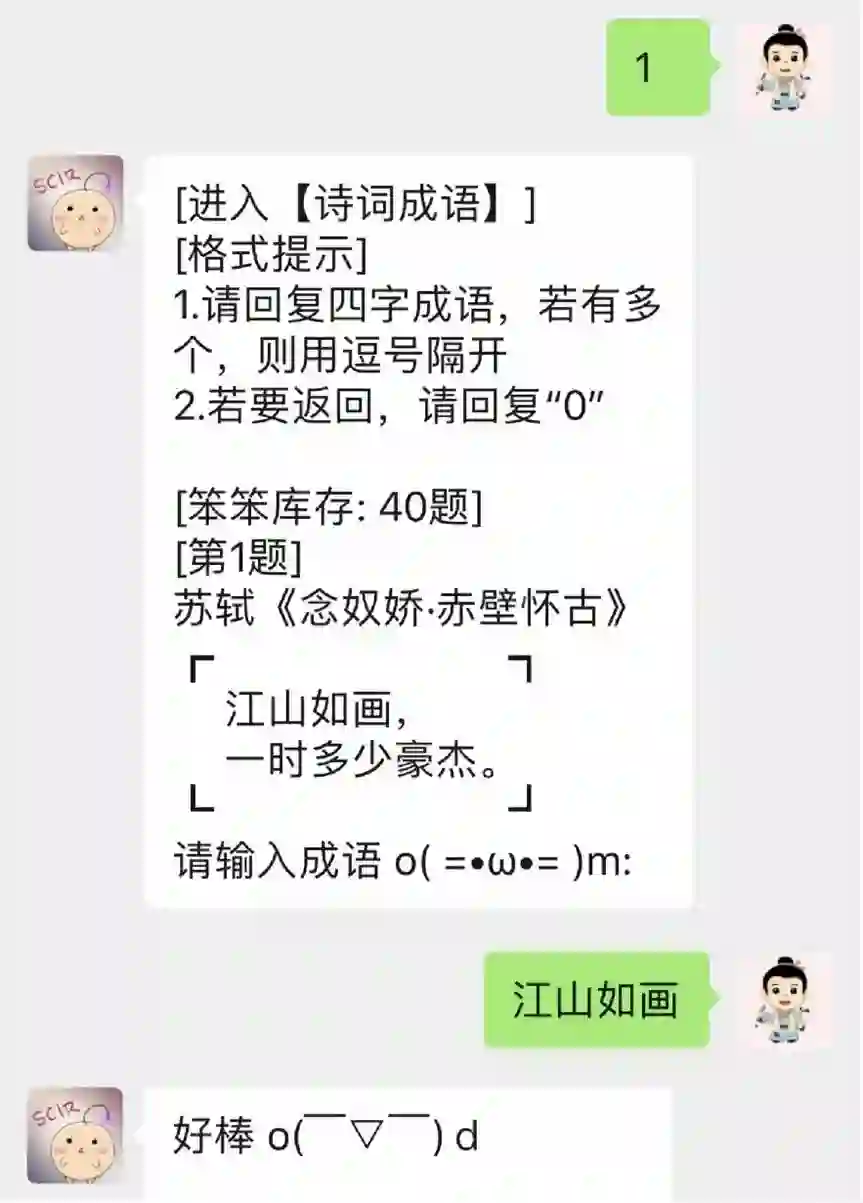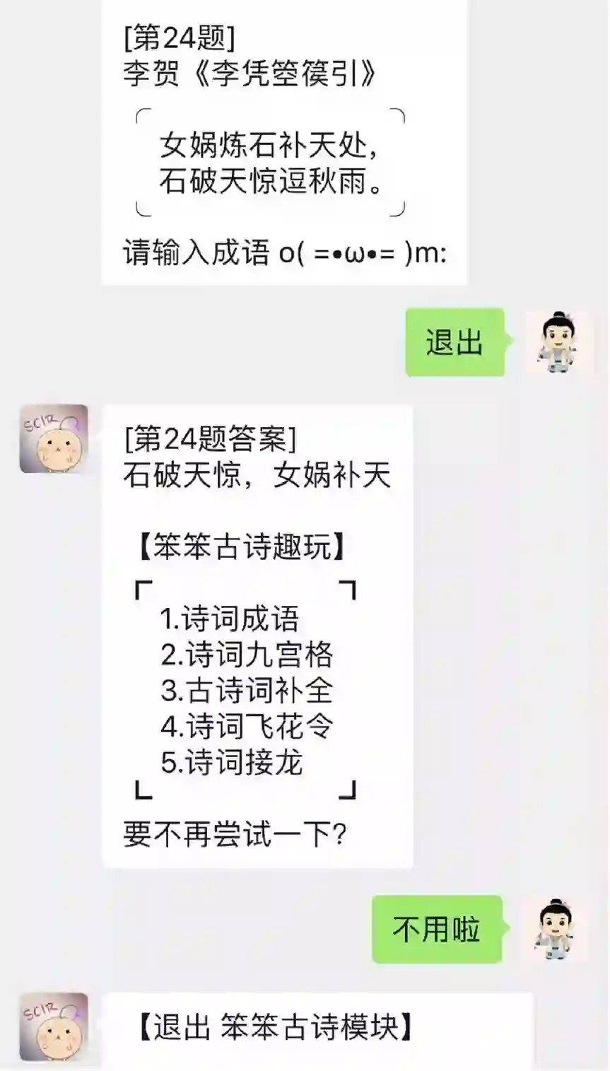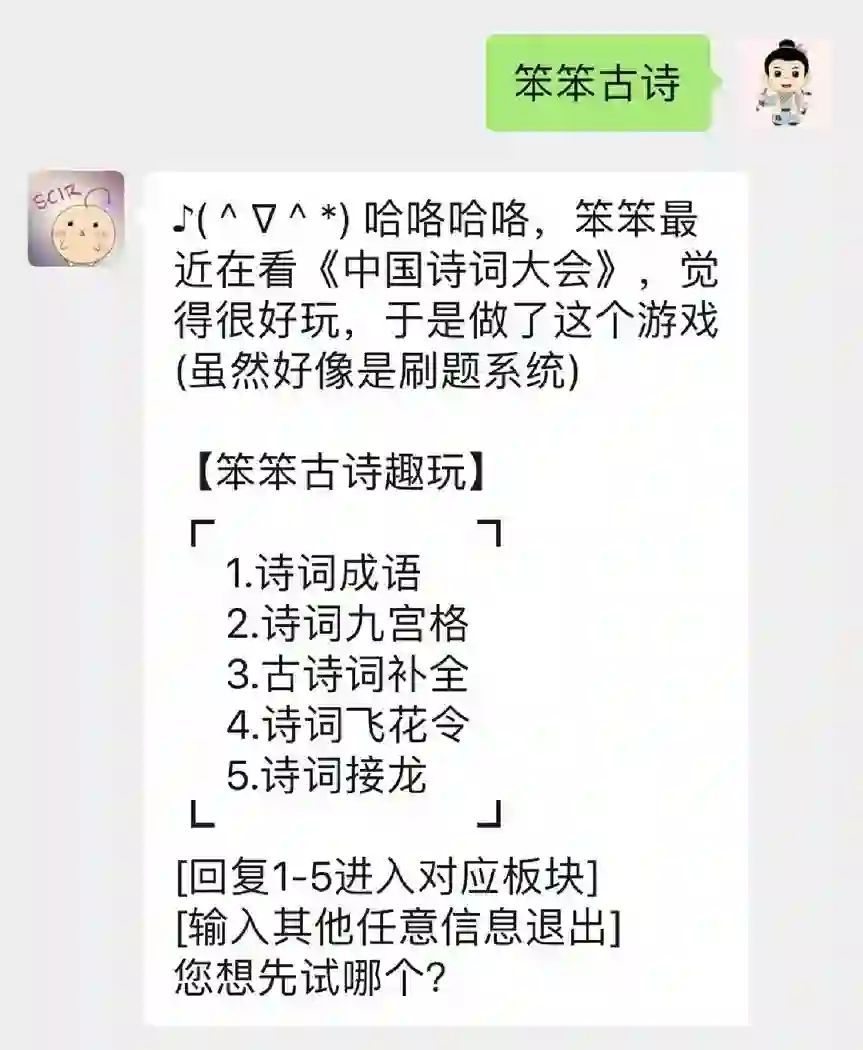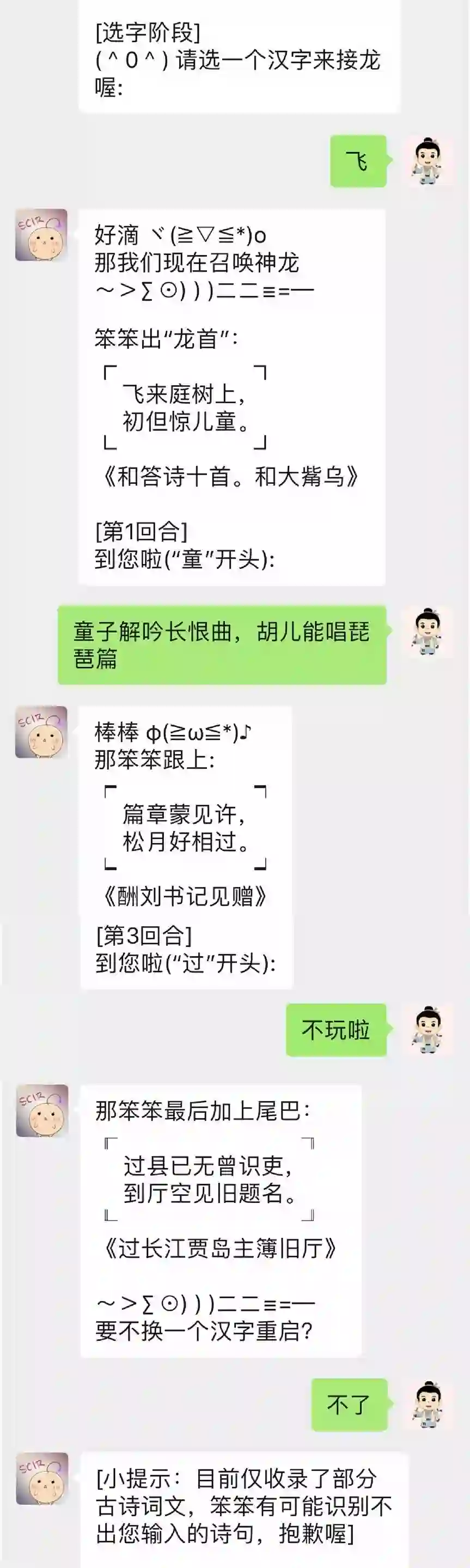 最近“笨笨”对作诗很感兴趣,背了很多首古诗。现在的“笨笨”可是一个大诗人,能陪您玩诗词成语、诗词九宫格、古诗词补全、诗词飞花令、诗词接龙等五个游戏。