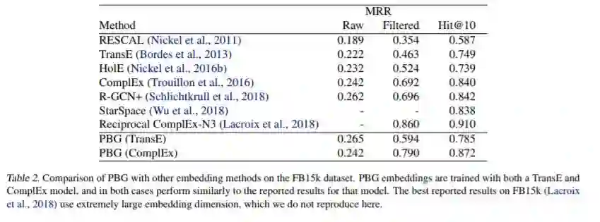 PBG 的表现与 TransE 和 ComplEx 模型的报告结果相当。 此外,最近的论文报告了 FB15k(以及像 WordNet 这样的其他小型知识图)使用具有数千个维度的嵌入的 ComplEx 模型的获得非常好的结果(Lacroix 等,2018)。 我们设法在 PBG 框架中重现这些体系结构和结果,但由于篇幅,不在此处报告详细信息。