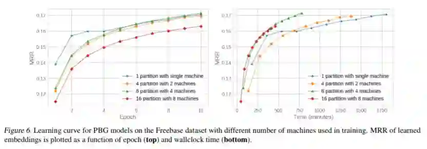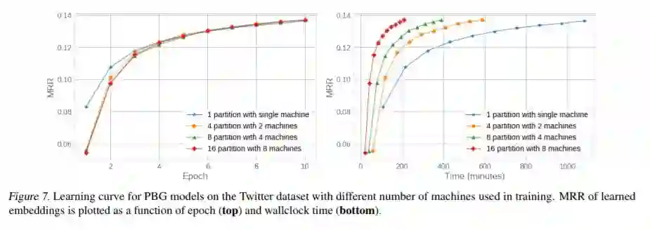 在图 7 中,我们报告了在训练过程中使用不同数量的机器获得的测试 MRR 学习曲线。与图 6 中的 Freebase 知识库学习曲线相比,Twitter 图显示了训练时间的线性比例,因为图是并行化分和训练的。
