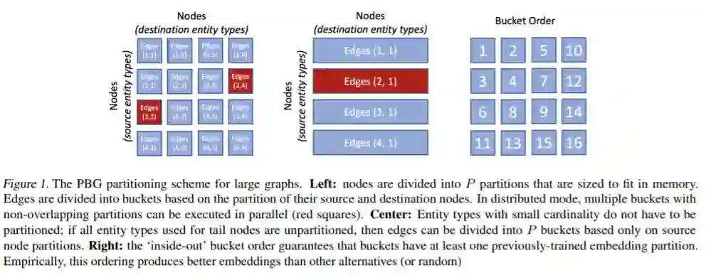 在本文中,我们提出了一个嵌入系统 PyTorch-BigGraph,它可以扩展为具有数十亿个节点和数万亿个边的图。PBG 支持多实体、多关系图,并支持按关系配置,如边权重和选择关系运算符。为了节省内存使用并允许并行化,PBG 将邻接矩阵分块分解为 N 个桶,一次从一个桶边上训练。