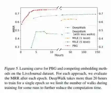我们将 PBG 嵌入性能与 MILE 进行了比较,MILE 也可以扩展到大型图。MILE 反复地将图粗化为较少的图,并在每个级别的粗化图上应用传统的嵌入方法,最后进行细化,得到原始图的嵌入。文中还展示了基于 MILE 嵌入的 DeepWalk 的性能。
