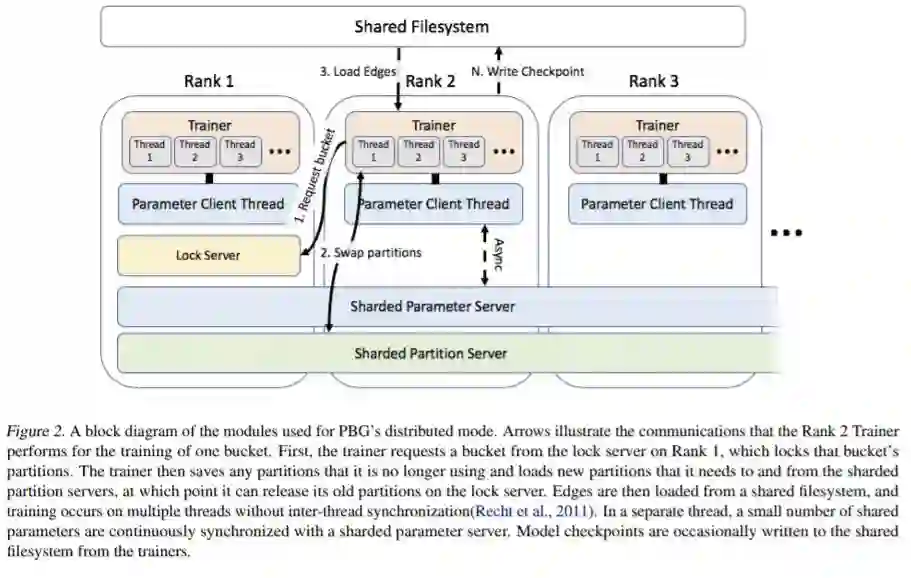 分区嵌入本身存储在跨 N 个训练机器分片的分区服务器中。机器从分区服务器获取源和目标分区(通常大小为好几 GB),并在从共享磁盘加载的边桶上训练,分区实体的检查点间歇性保存到共享磁盘。