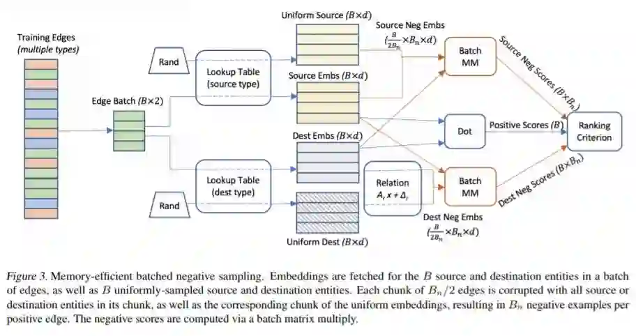 为了提高大型图的内存效率,我们观察到可以重复使用单批 Bn 采样源或目标节点来构造多个负样本。在一个典型的设置中,PBG 从训练集中取一个批次 B=1000 的正边样本,并将其分成 50 个边的块。来自每个块的目标(同样,源)嵌入与从尾部实体类型均匀抽样的 50 个嵌入连接起来。50 个正例与 200 个采样节点的外积等于 9900 个负样本。训练计算总结在图 3 中。