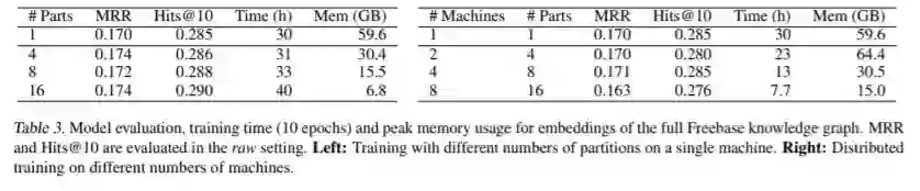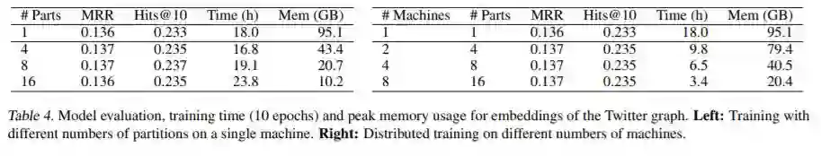 我们对每个模型迭代 10 个 epoch 进行训练,使用跟 FB15k 相同的网格搜索策略,对每个分区进行超参数搜索。对于多机的评估,我们使用跟单机中取得最佳性能一致的超参数设置。