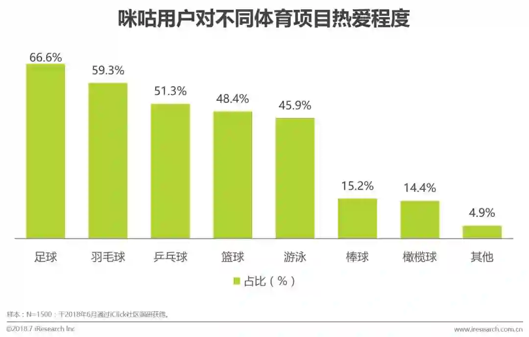 然而无论用户是否观看世界杯赛事,足球作为世界第一大运动,仍收获着最高的关注度和喜爱程度。在咪咕用户中,热爱足球的用户数目占总体用户的66.6%,高于第二名羽毛球59.3%。
