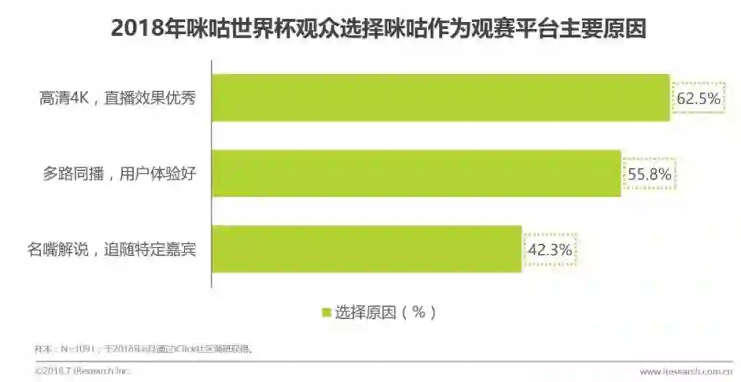 智能设备的普及和网络传输速度的提升等原因让通过移动设备观看赛事的体验不断提升,因此在世界杯开赛之后,大量球迷纷纷涌入了拥有比赛转播权的视频APP 。其中,咪咕视频的“高清4K”、“50帧原画”、“多路同看”等“黑科技”以及诸多名嘴解说的加盟大大提高了比赛的观赏性,吸引了大量球迷使用。