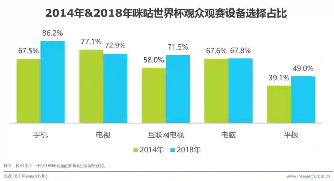 作为全世界球迷四年一次的狂欢节,世界杯是每个球迷都翘首以盼的赛事。今年的世界杯不仅仅可以通过电视转播观看,咪咕和优酷视频及旗下APP都获得了赛事的直播权。正是如此,越来越多的球迷愿意通过手机和平板等移动设备观看比赛,相比上次世界杯,这次会通过平板观看的观众达到了49%,较上次世界杯增长接近10%。而会通过手机观看赛事的观众更是达到了86.2%,比上届世界杯时增长18.7%。