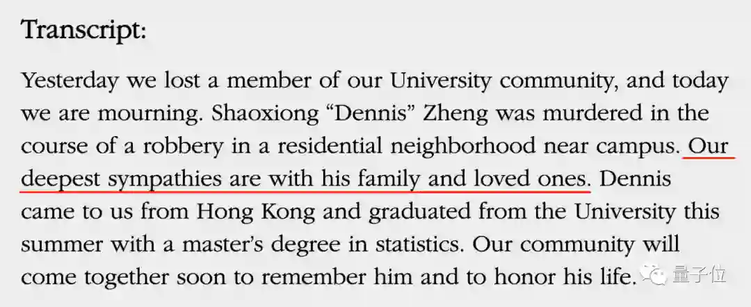 随后,芝加哥大学校长Paul Alivisatos对郑同学的不幸离世表示哀悼。