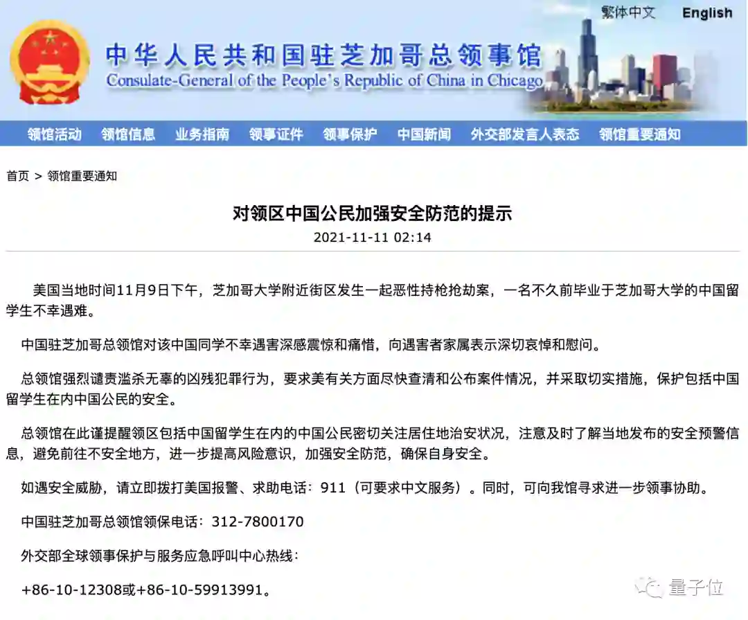 对此,驻芝加哥总领事馆也提醒中国留学生在内的中国公民,密切关注居住地治安情况,如果遇到安全威胁,请立即拨打美国报警、求助电话,同时可向领事馆寻求进一步协助。